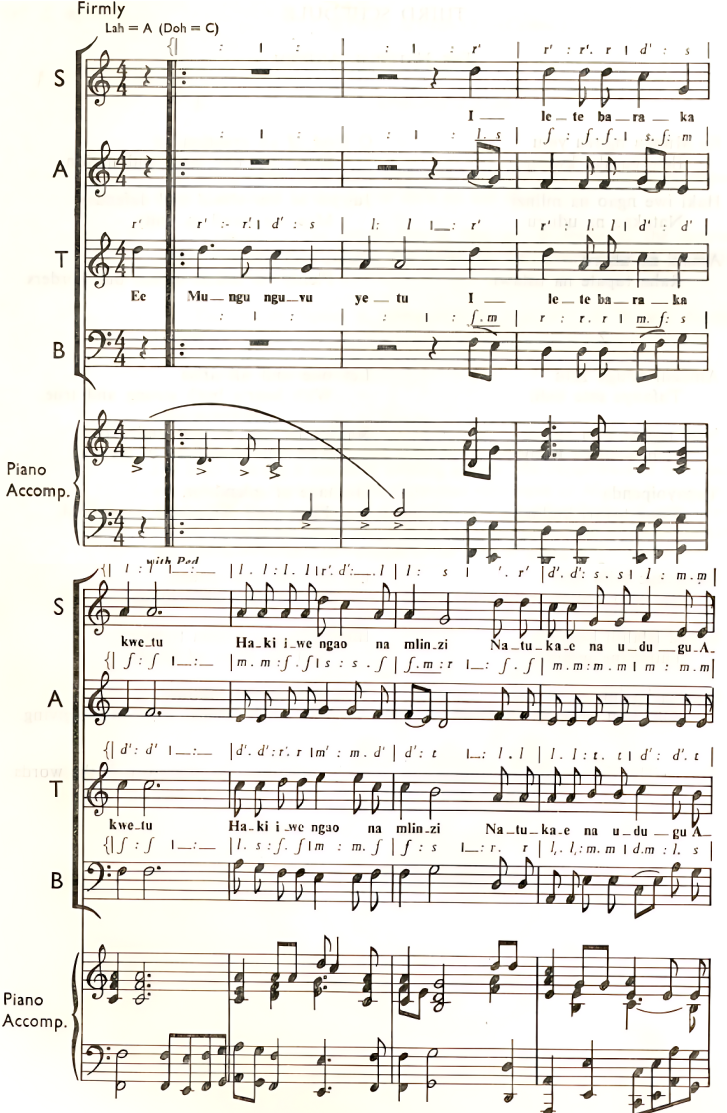 Let all with on accordIn common bond united,Build this our nation togetherAnd the glory of KenyaThe fruit of our labourFill every heart with thanksgiving.