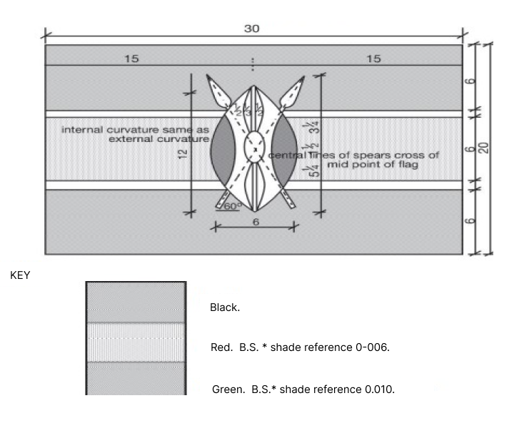 Three major strips of equal width coloured from top to bottom, black, red and green and separated by narrow white strips, with a symmetrical shield and white spears superimposed centrally.