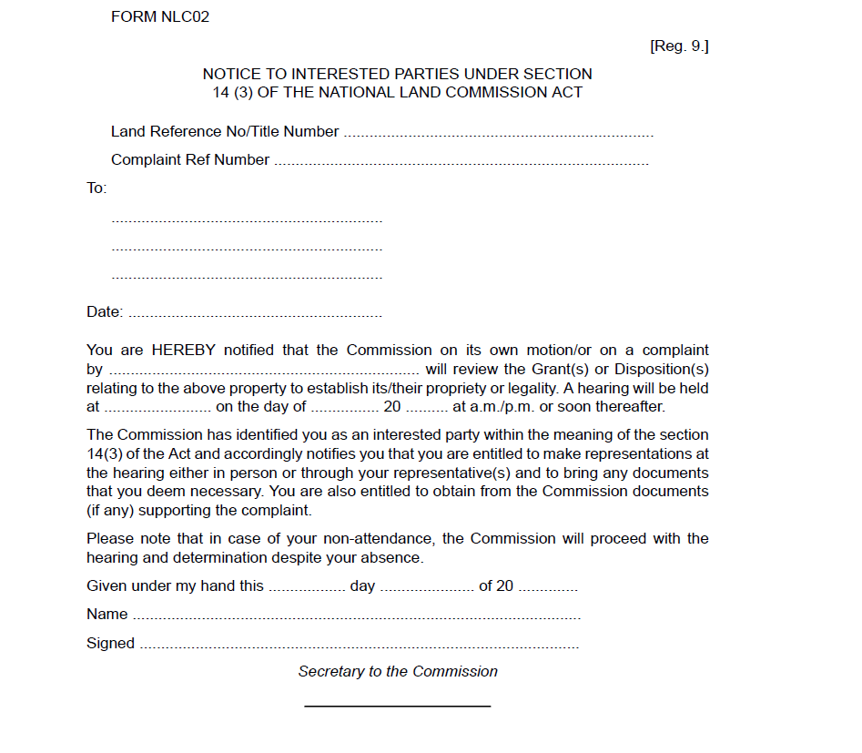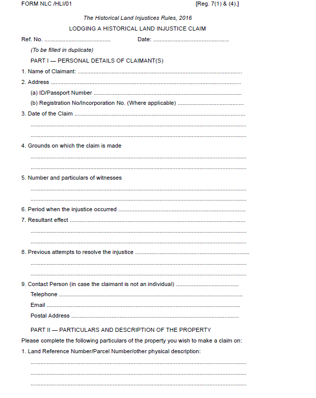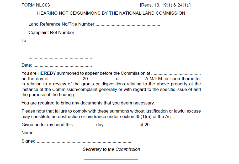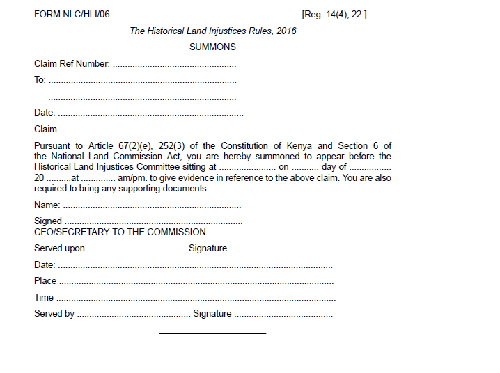 Pursuant to Article 67(2)(e), 252(3) of the Constitution of Kenya and Section 6 of the National Land Commission Act, you are hereby summoned to appear before the Historical Land Injustices Committee sitting at ................................ on ....................... day of ........................... 20 .......................... at ....................... am/pm. to give evidence in reference to the above claim. You are also required to bring any supporting documents.