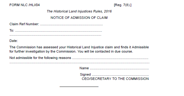 The Commission has assessed your Historical Land Injustice claim and finds itAdmissible for further investigation by the Commission. You will be contacted in due course
