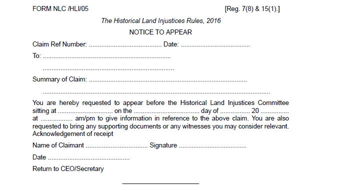 You are hereby requested to appear before the Historical Land Injustices Committee sitting at ........................ on the ........................ day of ....................... 20 .............. at ........................am/pm to give information in reference to the above claim. You are also requested to bring any supporting documents or any witnesses you may consider relevant.